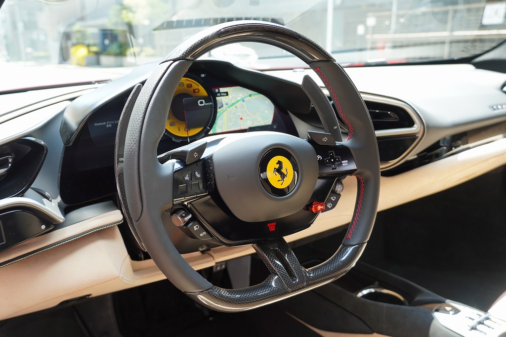 オプションのLEDカーボンファイバーステアリングが装備されております! フェラーリと言えば、このオプションと思われる方も多いのではないでしょうか?
