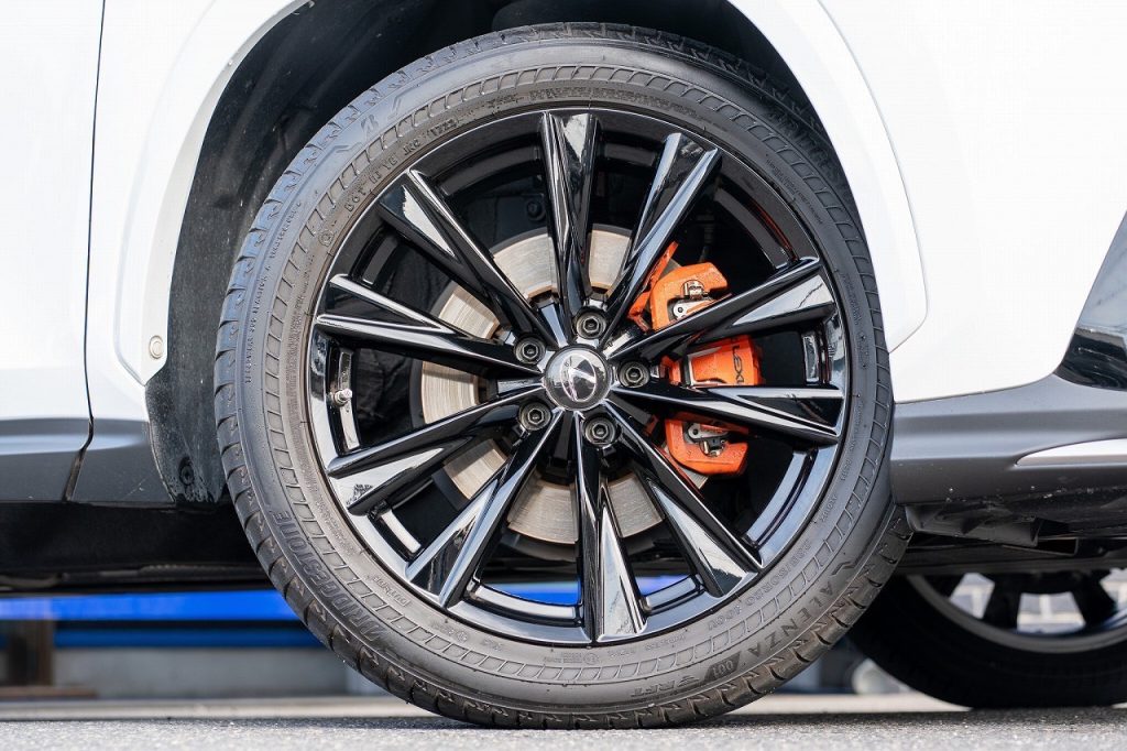 ホイールは純正20インチAWとなっており、オプションのオレンジペイントキャリパーが差し色でおしゃれになっております。タイヤの溝もまだまだありますのでそのままお乗り頂ける一台になります!