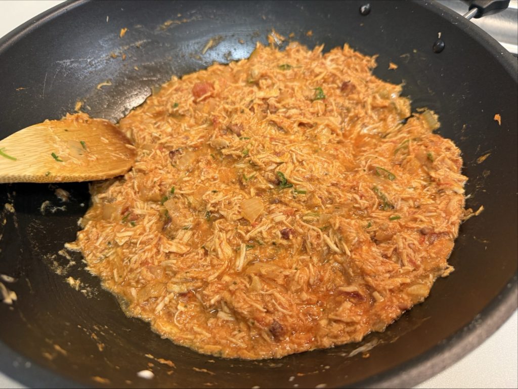 鶏むね肉を圧力鍋で火を通しほぐしたら、野菜を入れてトマトソースで炒めます。