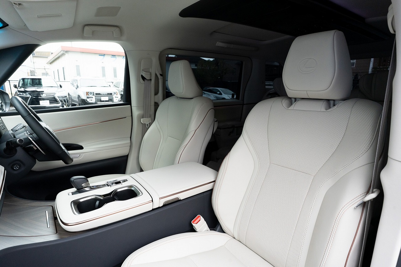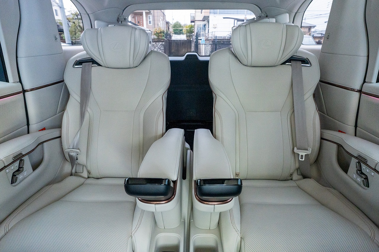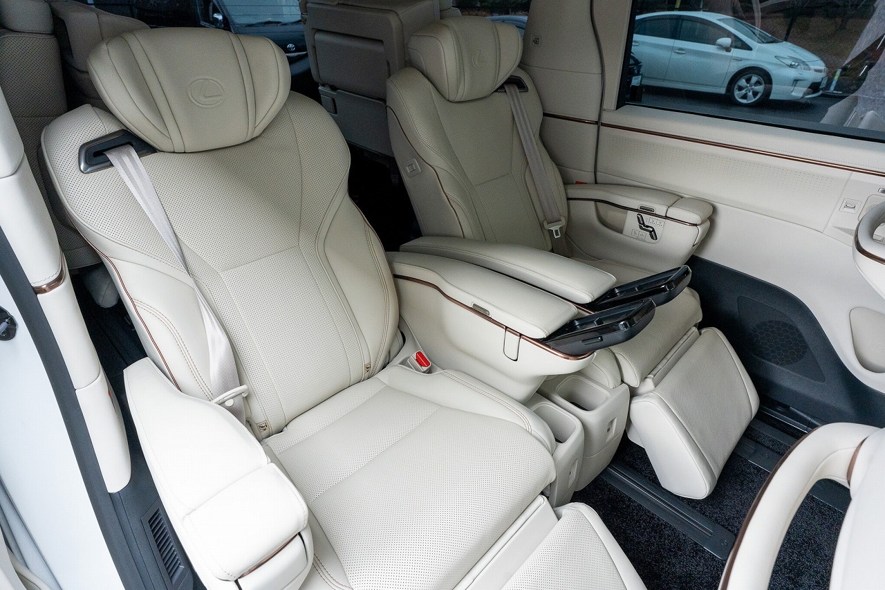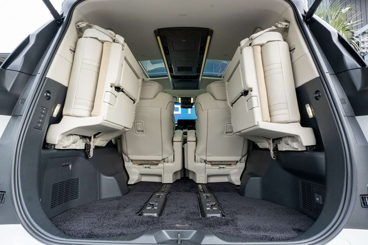 6人全員がゆったり座れるように設計された 3列シート配置。特に2列目シートはパワーオットマンやリクライニング大きめの仕様が多く、快適性が高いです!